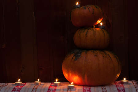 Pumpkin. Pyramid Of Three Orange Pumpkins With Candles. Fresh Vegetables.