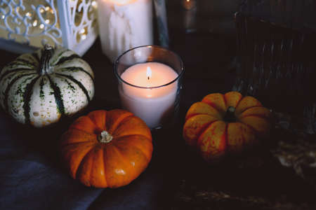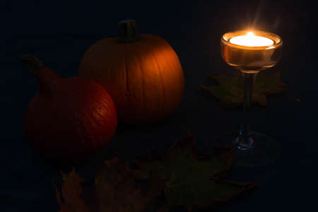 Autumn still life with pumpkins, leaves and burning candle on a black background