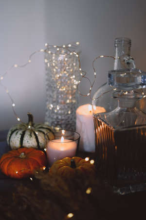 Cozy autumn composition with pumpkin, wax candles, dry leaves by bokeh lights background. Fall, Halloween, Happy Thanksgiving concept