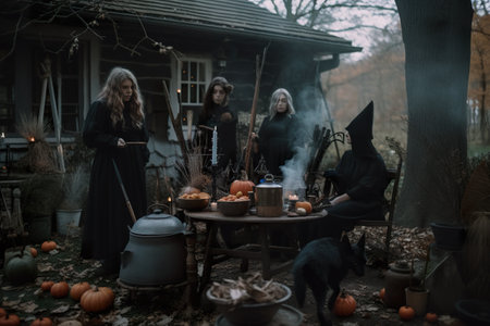 A group of witches sitting around a table. AI generative Halloween costume party.