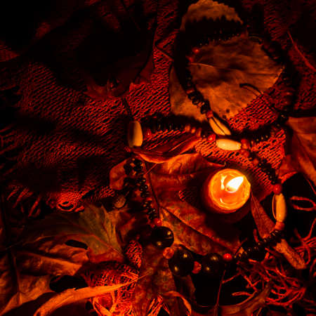 Still life of a bee wax candle surrounded by autumn leaves and a seed necklace. Low key