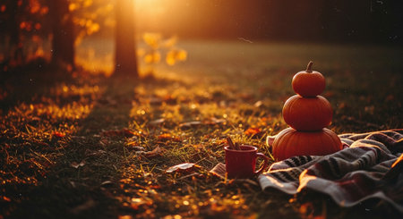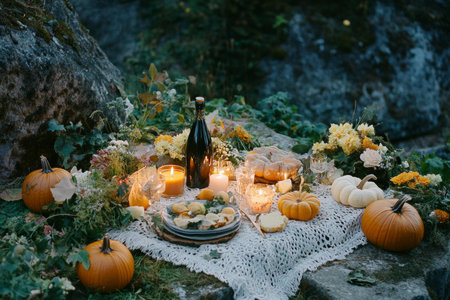 a picnic set up with lanterns positioned amongst fallen leaves, created with generative ai