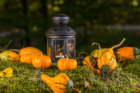 Purple lantern, green pumpkin rowan berries and candle on wooden rustic table