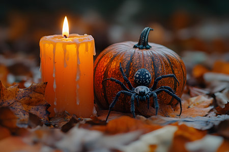 A close-up scene featuring a lit candle, a small pumpkin, and a realistic spider amidst autumn leaves. perfect for halloween and fall-themed designs, evoking warmth and seasonal spookiness. Generative AI