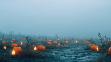A serene and enchanting scene of a misty pumpkin patch illuminated by glowing lanterns, creating a magical autumn atmosphere filled with mystery.