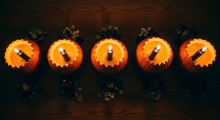 Five carved pumpkins with lit candles inside arranged in a row. Halloween celebration and autumn season concept for greeting card.