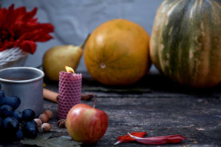 Natural cozy home with mug of tea, fruits, hazelnuts and cinnamon sticks. Autumn aesthetic concept. Cozy home with warm tea and aromatic candle. Thanksgiving Day concept. Home aromatherapy.
