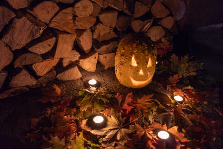 halloween jack-o-lantern on autumn leaves. Scary Halloween Pumpkin looking through the smoke. Glowing, smoking monster pumpkin from depths of hell