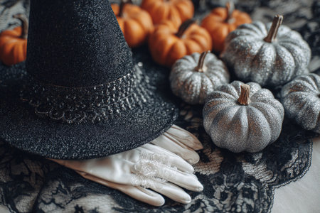 Set against a rich black lace backdrop, a stylish witch hat and elegant white gloves rest beside a gathering of glittering silver and vibrant orange pumpkins, capturing the essence of Halloween charm.