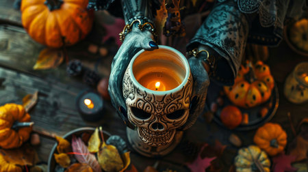 A spooky Halloween cocktail served in a Jack-o'-Lantern glass, held by a skeleton hand, with pumpkins and candles in the background, creating a chilling festive atmosphere of Helloween holiday