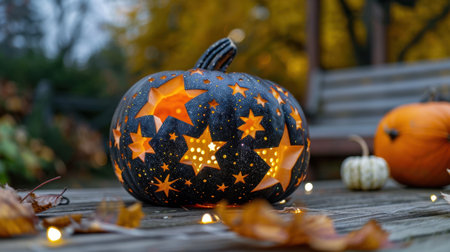 A beautifully carved Halloween pumpkin featuring star cutouts that emit a warm glow, surrounded by autumn leaves and other pumpkins, creating a cozy fall atmosphere.