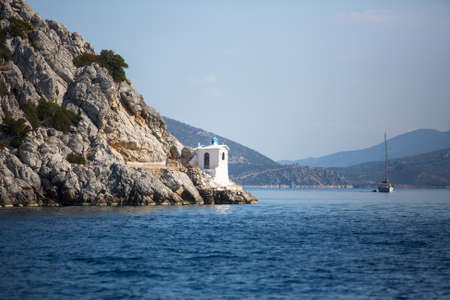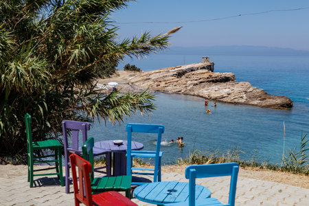 Summer time in Greece. Beautiful Greek coastline next to sea shore during warm weather.