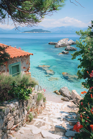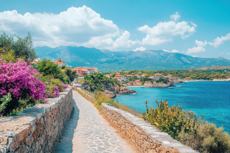 A beautiful stone pathway lined with colorful flowers leads to the sparkling blue waters and majestic mountains in the background.