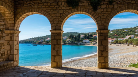 An inviting coastal landscape is framed by three stone arches. The scene captures the sea meeting the shore. The sunny day illuminates the textured stone and the turquoise water. A row of houses are on the hill under a clear blue sky. The composition emphasizes the interplay between architecture and nature.