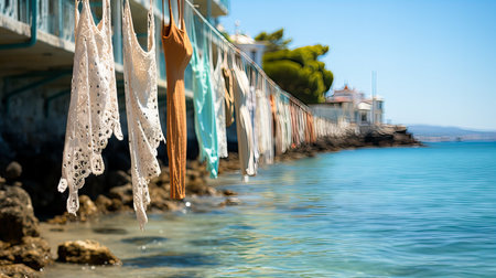 Laundry drying on the beach in Greece. Selective focus.