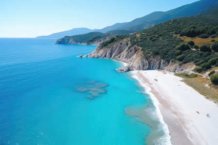 Aerial view of the beautiful beach in Kefalonia, Greece, Aerial flight with drone over famous beach of Kavalikefta on the island of Lefkada in the Ionian Sea in Greece, AI Generated