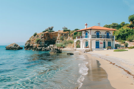 Small white house on the cliff of coast. Generative AI illustration