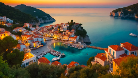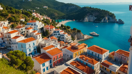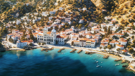 Tranquil Greek fishing village with whitewashed houses fishing boats