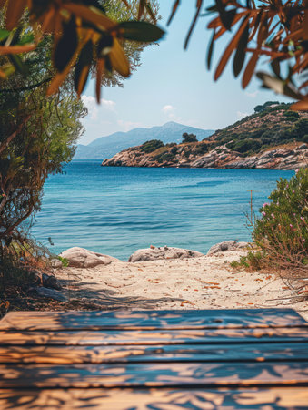 Escape to a tranquil summer paradise Lush foliage frames a serene beach, revealing crystal clear turquoise waters sparkling under a sunny sky The picturesque scene is completed by a majestic mountain backdrop, promising a day of blissful relaxation AI Generative