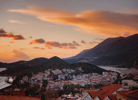 Harbor of city Kas or Kash in Turkey and Greek island Kastelorizo on sunset time. Charming view of seaside resort town. Romantic harbor with yacht marina and mosque with minarets