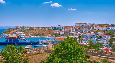 Bozcaada, Turkey, View of the port, fortress, Aegean Sea and Colorful streets with old beautiful houses and bright flowers
