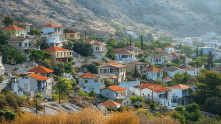 Traditional Greek houses with terracotta roofs are bathed in warm morning sunlight on a hillside in this idyllic village