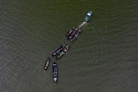 Aerial view of Boats on Limboto lake. Rowing boats drift over the waters of Lake Limboto. Gorontalo, Indonesia