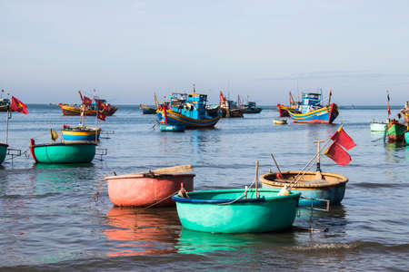 Mui Ne, Vietnam - Feb 23, 2017. Fishing boats docking on the sea in Binh Thuan, Vietnam. Binh Thuan Province is known for its beaches and coastal roads.