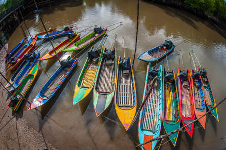 Group of wooden boats at lake Bali ,Indonesia. Filter:Vintage effected.
