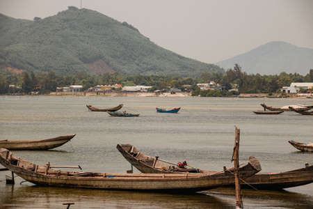Cinematic scenery of traditional Vietnamese wooden boats moored in Duy Vinh Fishing Village in Vietnam