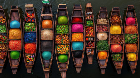 Aerial view of a vibrant floating market showcasing an array of colorful spices and fresh fruits arranged in traditional wooden boats, highlighting local trade.