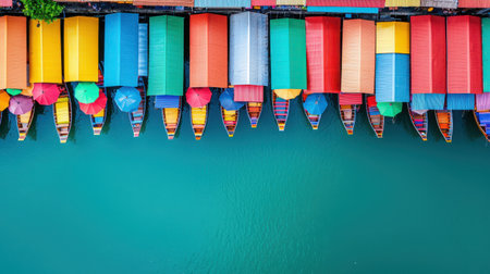 A stunning aerial view of a colorful floating market showcases vibrant boats and umbrellas on serene water. This scene captures culture, trade, and tourism in harmony.