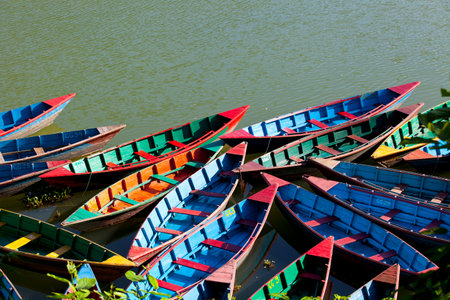 Small wooden boats on the Phewa Lake in Pokhara, Nepal