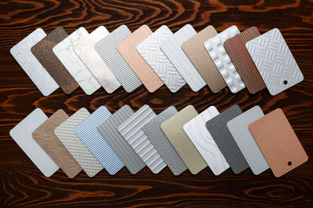 Metal laminate samples laid out on a brown wooden background. Flat lay, Top view