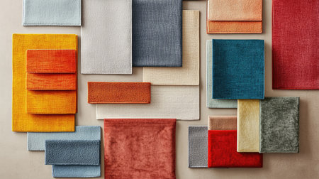 A visually appealing arrangement of colorful textured samples showcases various surfaces ideal for interior design and decoration projects.
