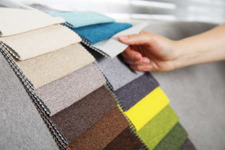 female designer with fabric color samples choosing textile for curtains