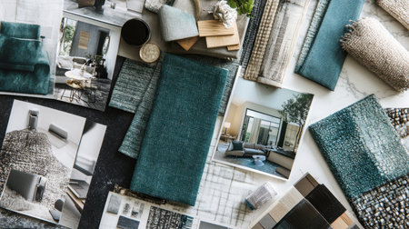 A captivating interior design mood board featuring a variety of textiles, color swatches, and inspiring photographs, perfect for creative professionals seeking visual ideas for modern living spaces.