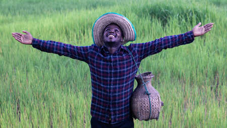 Happiness african farmer with hat stand in the organic rice field.Agriculture or cultivation concept