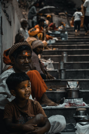 Street photograph of a poor child beggar sitting on the stairs among other beggars in the city of Dehradun, Uttarakhand, India