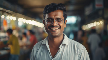 Engaging portrait sociologist in street market crowd colorful stalls daylight
