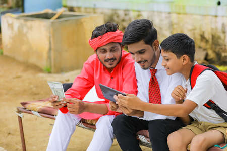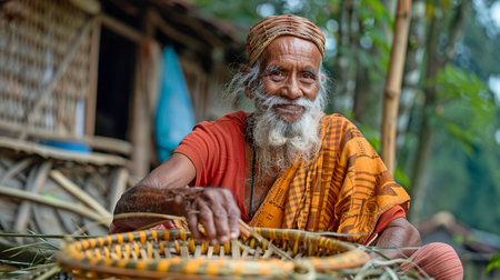 A portrait of a man in a rural Indian setting, looking directly at the camera with a serious expression. His dark hair is slightly graying, and he has a thick beard and mustache. The background is blurred, focusing attention on the man's face and the intensity of his gaze.