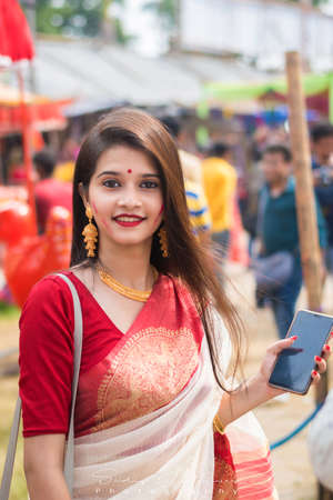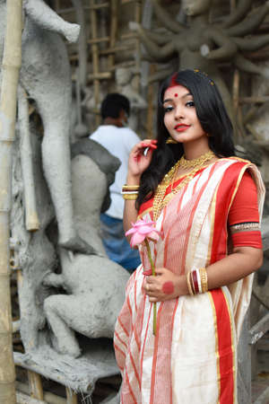 Portrait of a young and beautiful Indian woman in red and white traditional ethnic sari and gold jewellery in front of the clay idol of hindu goddess Durga. Indian culture, religion and fashion