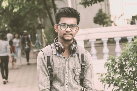 Half length portrait of attractive young a man called Ahok standing outside school building with modern headphone and looking at camera. A music student portrait photography on 21 June World Music Day