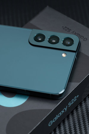 New york, USA - January 31, 2022: New camera module in Samsung galaxy s22 plus smartphone with box close up view