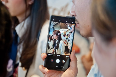 BANGKOK, THAILAND - NOVEMBER 23, 2018: Dusita Kitisarakulcha (Natherine), a member of Thai Idol girl group BNK48, is in the focus of camera phone screen in Gontran Cherrier bakery grand opening public event. There are many staff and band members in the sc