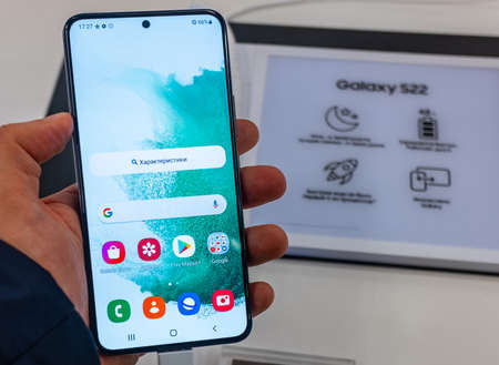 February 15, 2022, Moscow, Russia. The new Samsung Galaxy S22 mobile phone in a store window.