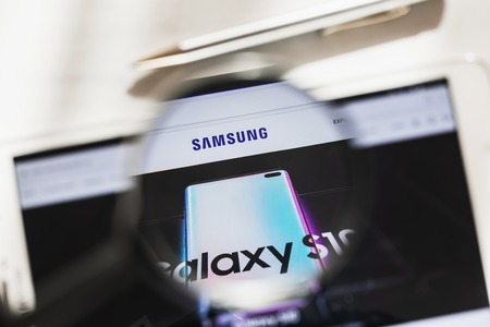 Las Vegas, USA - 6 March 2019: Samsung Group, Samsung Electronics official website homepage under magnifying glass. Concept Samsung Group, CES, Electronics logo visible on smartphone, tablet screen