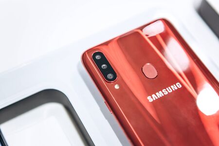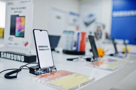 Kyiv, Ukraine - October 28, 2019: New Samsung Galaxy A20 mobile smartphones are displayed on retail display in electronic store.