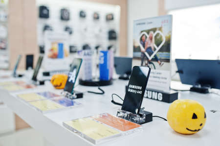 Kyiv, Ukraine - October 28, 2019: New Samsung mobile smartphones are displayed on retail display in electronic store.