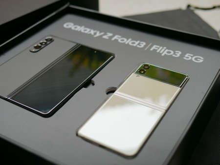 Bangkok, Thailand - August 11, 2021: Samsung officially launches the latest foldable flagship smartphone, the Samsung Galaxy Flip 3.